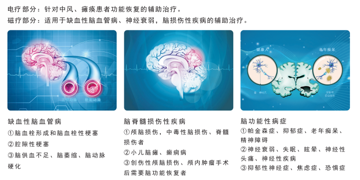腦梗塞、腦出血、顱腦損傷、腦動脈硬化、腦供血不足、頸動脈狹窄、以及卒中后記憶力減退、吞咽障礙眩暈、焦慮、抑郁、失眠、失憶、失語等。