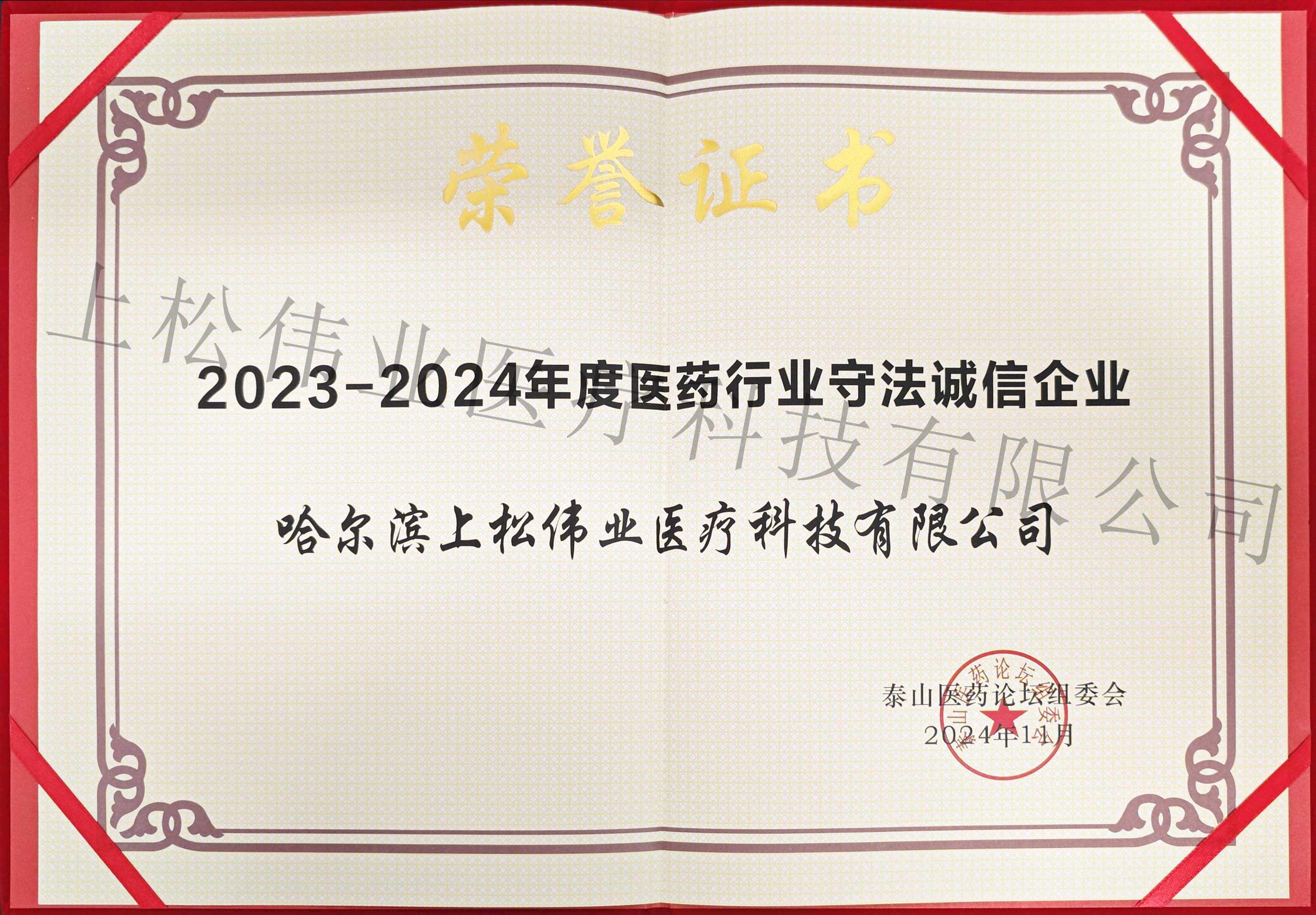 上松偉業(yè)再次榮獲2023—2024年度“醫(yī)藥行業(yè)守法誠信企業(yè)”