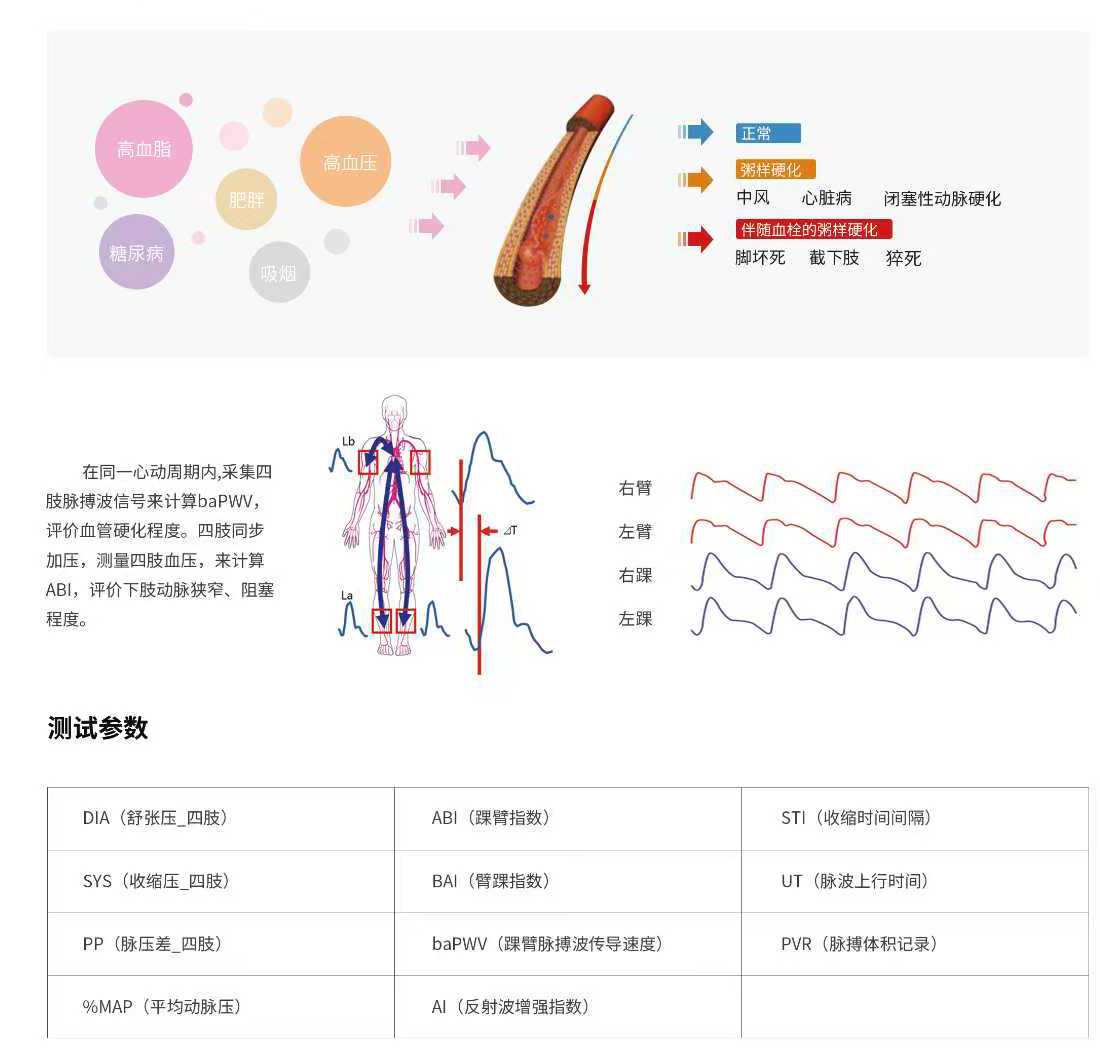 2.可檢測(cè)參數(shù):baPWV、ABI、BAI、UT、MAP%、SYS、DIA、MAP、PP、AI