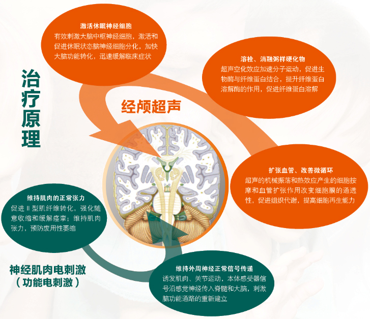1、經(jīng)顱超聲:改善腦部微循環(huán),并激活休眠狀態(tài)腦神經(jīng)細(xì)胞參與功能活動(dòng)