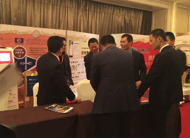 東北區(qū)銷售經(jīng)理張婷女士手拿公司資料手冊與公司主打產(chǎn)品卡波姆宮頸治療器在展板前合影