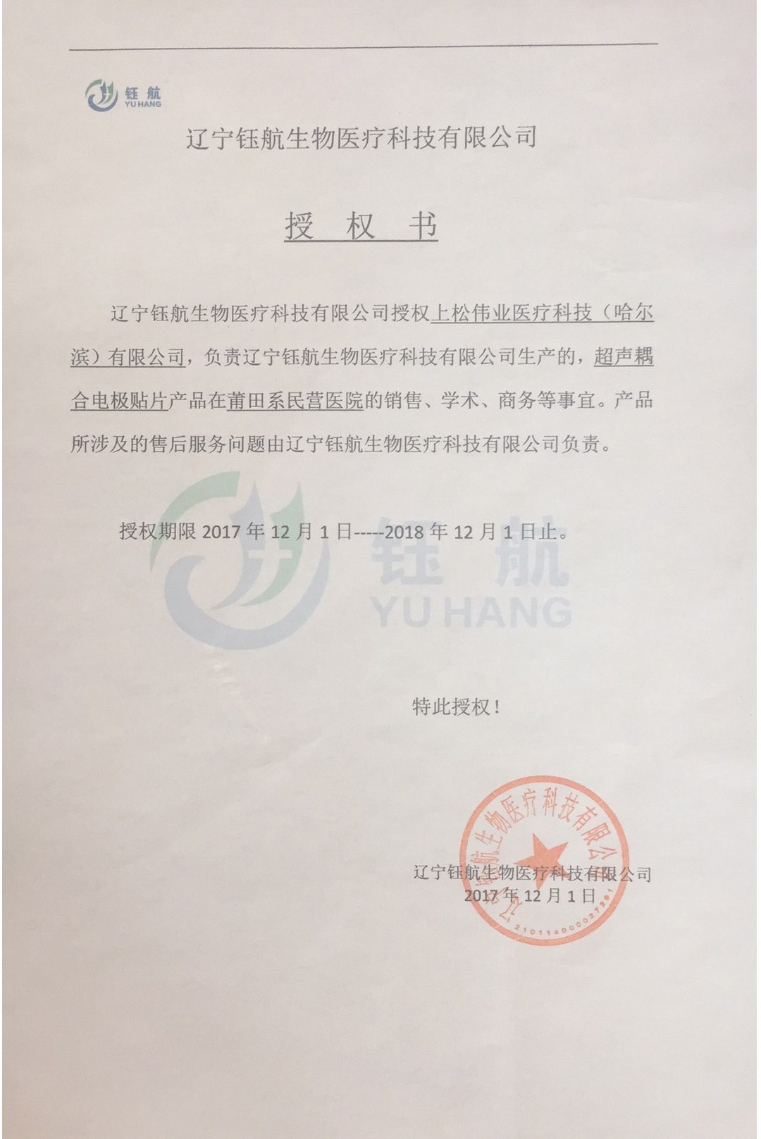 遼寧鈺航生物醫(yī)療科技有限公司授權(quán)