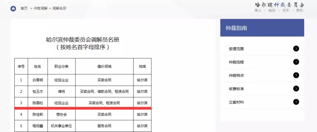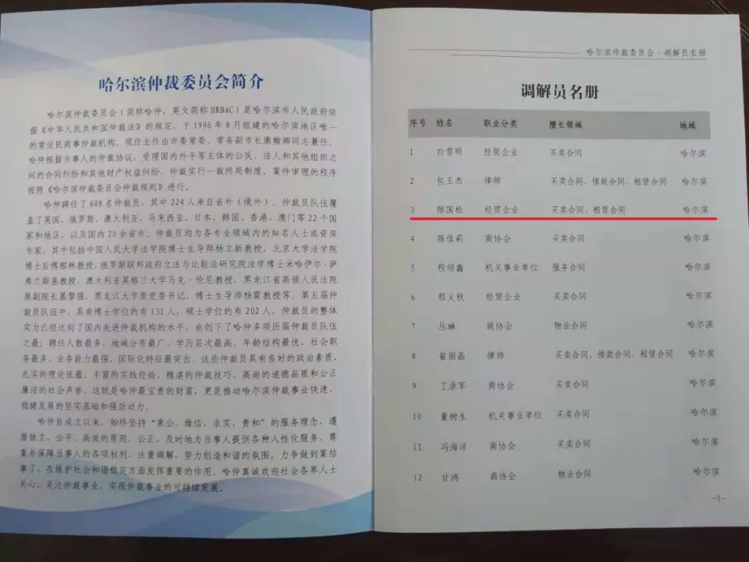 經(jīng)哈爾濱仲裁委員會研究決定,聘請我董事長陳國松先生獲聘擔(dān)任調(diào)解員一職。